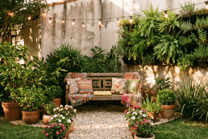 Por fim, dê protagonismo às cores. Pinte vasos antigos com tons vibrantes — azul-índigo, terracota ou amarelo mostarda — e espalhe tapetes próprios para área externa. O contraste direto com o verde faz cada cantinho saltar aos olhos e convida você a aproveitar o refúgio o ano inteiro.