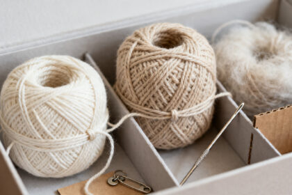 Com a classificação pronta, cada novelo recebe atenção especial na ponta solta. O fio é enrolado suavemente ao redor do rolo e fixado por um pequeno prendedor ou tira de velcro. Esse cuidado impede que a extremidade escape, se enrole em outros novelos ou perca tensão durante o manuseio.